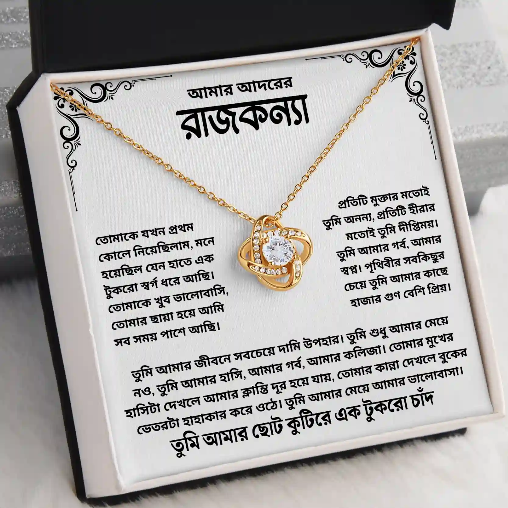 মেয়ের মুখে হাসি দেখার মতো সুখ পৃথিবীতে আর কিছু হতে পারে না। আর আপনার মেয়ের মুখে হাসি ফুটিয়ে তুলতে আমরা এনেছি অত্যন্ত সুন্দর ও প্রিমিয়াম কোয়ালিটির 18K Gold Plated Necklace—যা বাবা/মায়ের ভালোবাসা প্রকাশ করার জন্য নিখুঁত উপহার। মেসেজ কার্ডের মাধ্যমে একজন আদরের মেয়ের প্রতি মা-বাবার ভালোবাসা প্রকাশ করা হয়েছে। যে কথা আপনি কখনো আপনার মেয়েকে বলতে পারেননি।